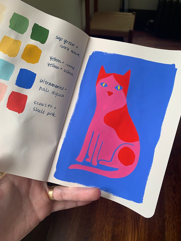 I mainly work in a sketchbook and have had an ongoing sketchbook since middle school. I actually remember begging my mom to take me to Borders by the mall to get my first one. They’ve been a place for me to work on new techniques or towards style development goals, see how color and materials interact, work through ideas for larger projects, and take big risks in a low stakes way.